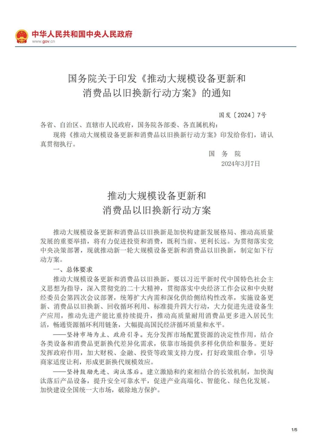 国务院关于印发《推动大规模设备更新和消费品以旧换新行动方案》的通知