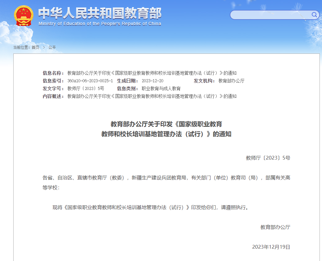 第一条 为深入贯彻落实党的二十大精神,落实习近平总书记关于职业教育和教师工作的重要指示批示精神,建立健全职业教育培训体系,加强全国职业教育教师、校长培训基地建设管理,打造一批国家级培训样板,根据《中华人民共和国职业教育法》,中共中央办公厅、国务院办公厅《关于推动现代职业教育高质量发展的意见》《关于深化现代职业教育体系建设改革的意见》等文件精神,制定本办法。