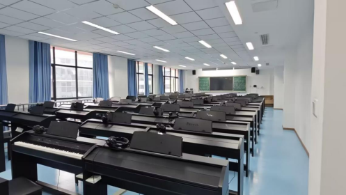 电子钢琴实训室主要用于对学生进行钢琴技能的集中教学。通过教师演示讲解、学生独奏、合奏、齐奏等形式,提高学生的即兴伴奏能力和钢琴演奏水平。该实训室集视、听、练为一体,配备数码钢琴教学中央控制系统,主要包括电钢琴、电脑、摄像机、多媒体投影等设备。通过该系统,可以实现主观化、立体化、集体化、小组化或个别化等多种钢琴教学形式,能实现整班集体琴法指法授课,能增强学生对电钢琴操作的感性认识,使学生熟练掌握钢琴的演奏及歌曲弹唱。